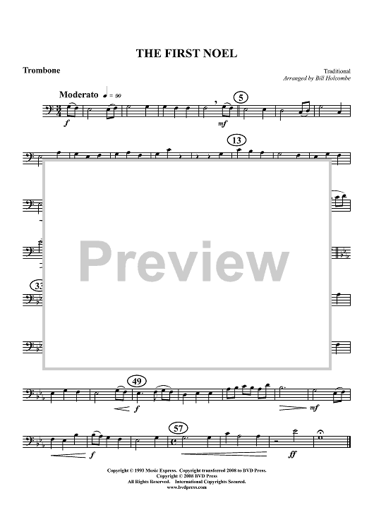 Digital Sheet Music for The First Noel - Trombone by , Traditional, Bill Holcombe scored for Brass Quintet; id:411768
