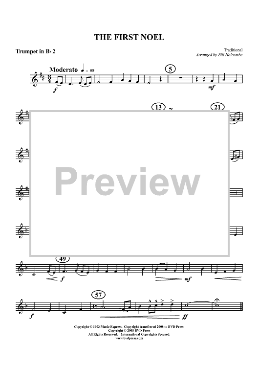 Digital Sheet Music for The First Noel - Trumpet 2 by , Traditional, Bill Holcombe scored for Brass Quintet; id:411766