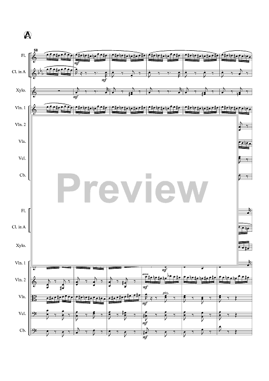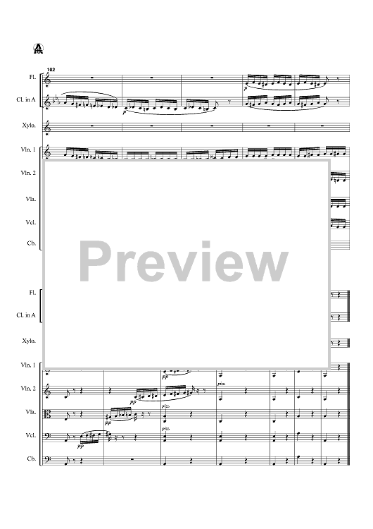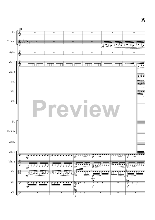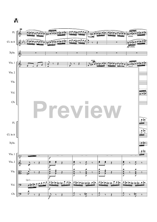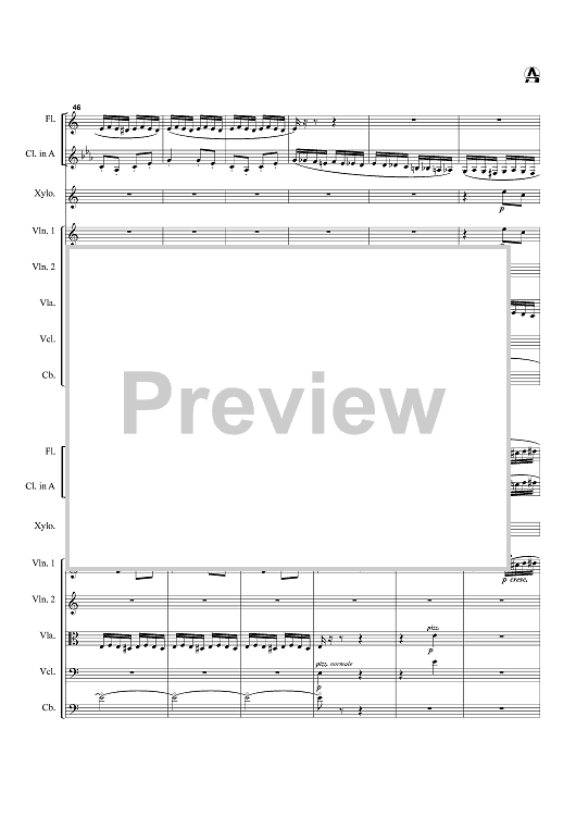 Instrumentation: Flute, Clarinet (Bb and A parts included), xylophone, 2 Violins, viola, cello, bass