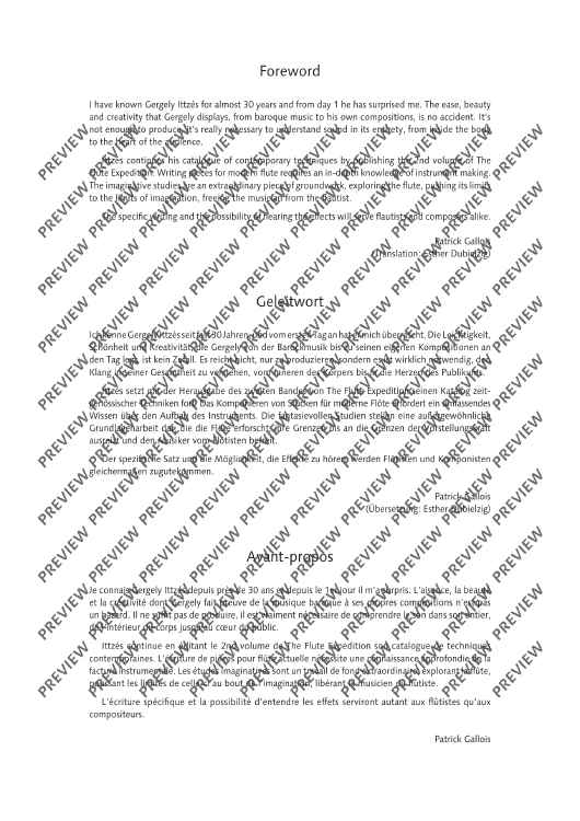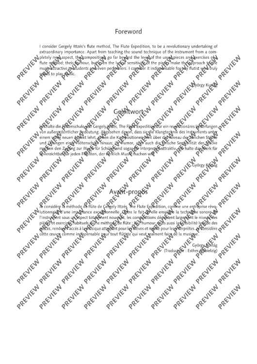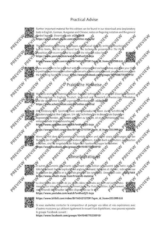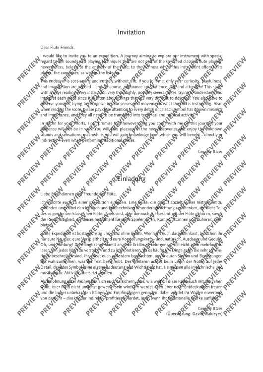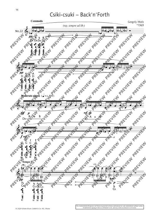 Professor Gergely Ittzés invites you to an expedition exploring the instrument flute, with a focus on sounds and playing techniques beyond classical flute playing. This journey requires curiosity, playfulness, imagination, perseverance, and patience. As a reward for your efforts, you can be certain that the journey will be worthwhile, regardless of how far you wish to go. You will make new discoveries and experience previously unknown sensations and sounds. Throughout this process, you will acquire knowledge that will benefit you directly or indirectly, even if you are performing traditional tasks. The edition is a valuable resource for anyone interested in the flute, whether for instrumental practice, composition, or the intensive study of this versatile instrument and its sound worlds. Gergely Ittzés presents 42 imaginative miniature studies that lead the reader into new worlds of sound. His precise instructions and fascinating interpretation of the pieces make Ittzés' Flute Expedition an indispensable travel companion. Ittzés is deeply influenced by Hungarian music and continues the tradition of Mikrokosmos (Bartók), Fingerlarks (Veress) and Játékok (Kurtág). Ittzés is a reliable and trustworthy artist when it comes to playing and performing the most demanding flute repertoire of our time. He provides guidance and inspiration for every nuanced gesture, explicit fingering, and technical, acrobatic, and polyphonic requirement. His latest work offers a guide to modern flute playing. Additional material, including explanatory texts in English, German, and Hungarian, as well as notes on fingering notation and symbol legends, is available for download at Schott. To implement the techniques used in this Flute Expedition effectively, accompanying video material is also available through the edition. There is also an opportunity to directly contact the author and discuss ideas and experiences of using Flute Expeditions with other musicians in an online group.