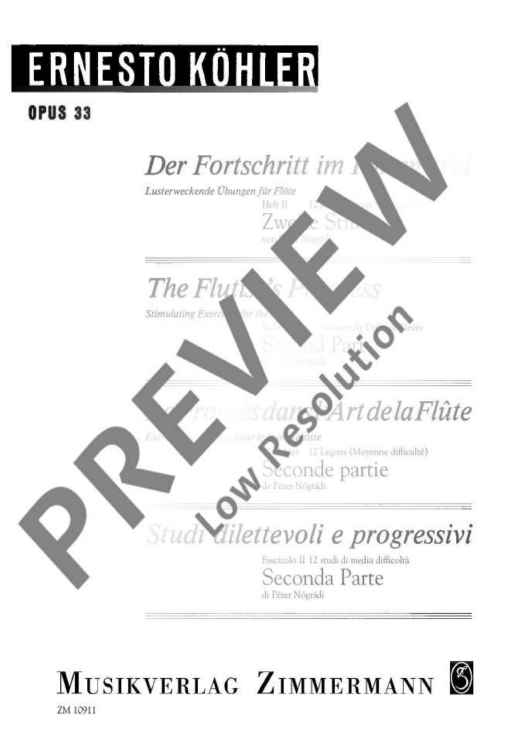 The writing of études for string instruments with an added second solo part is a well-established practice and constitutes a very valuable educational aid. In the second flute part for the études in Book 2 of Ernesto Köhler’s flute method presented in this edition, the Hungarian composer Péter Nógrádi has created many new playful elements and has not simply provided a mechnical semiquaver accompaniment. Nógrádi’s composition succeeds in clarifying the functional relationships in Köhler’s music and, by some surprising ideas, gives the two players the possibility of an enjoyable performance. Playing together with the second part demands great concentration and discipline and at the same time trains reactivity and score-reading, rewarding the conscientious student with a gratifying sense of achievement after a successful performance.
