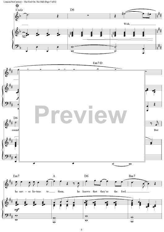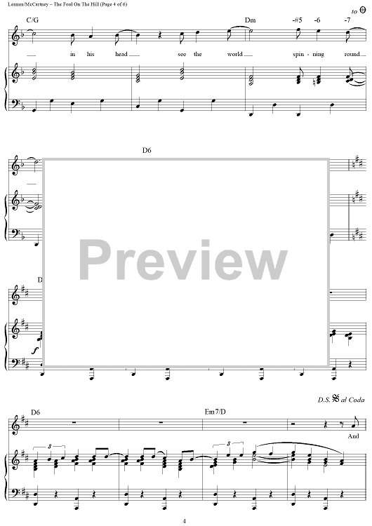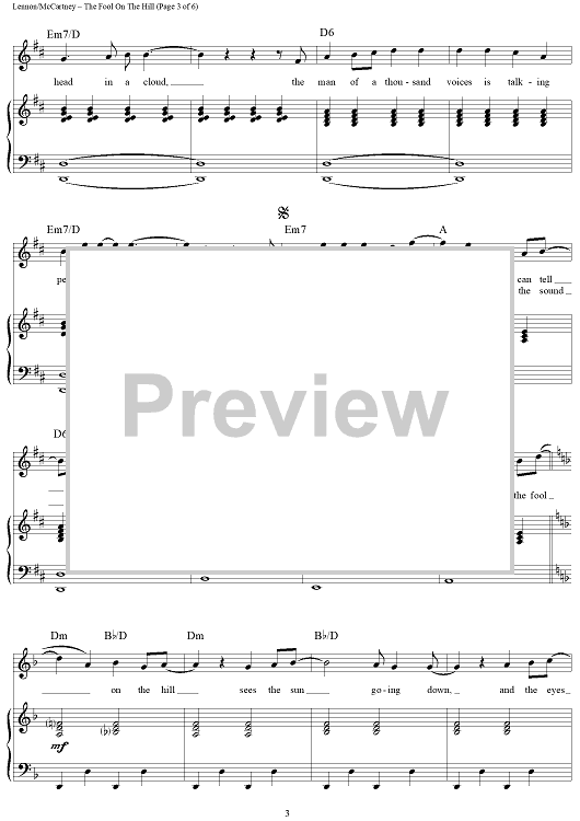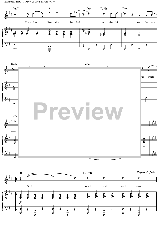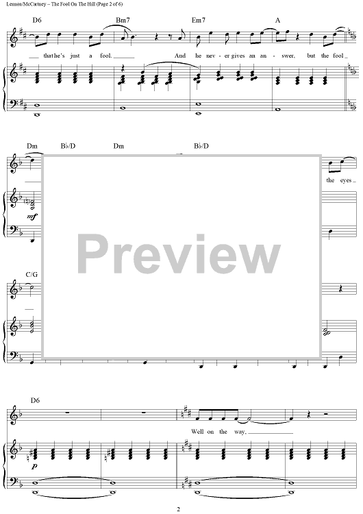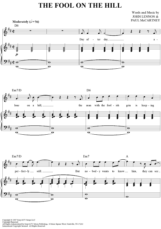 Digital Sheet Music for The Fool on the Hill by Paul McCartney, The Beatles, John Lennon scored for Piano/Vocal/Chords; id:361023