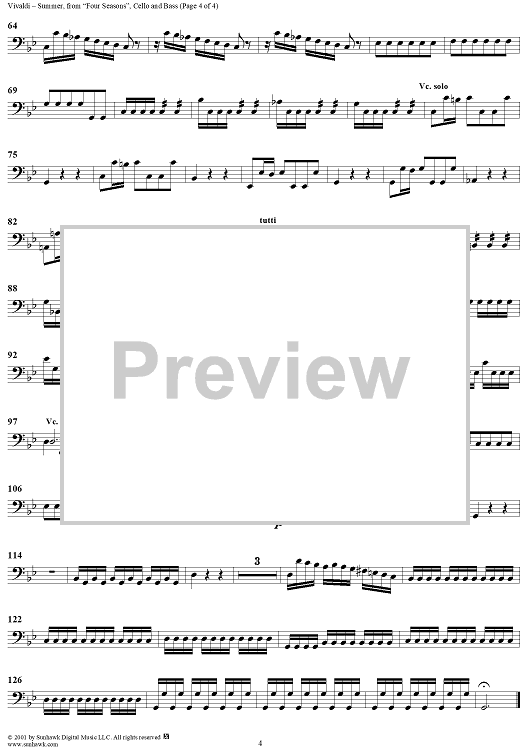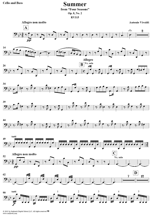 "The Four Seasons, no. 2: Summer - Cello/Bass" Sheet Music by Antonio Vivaldi