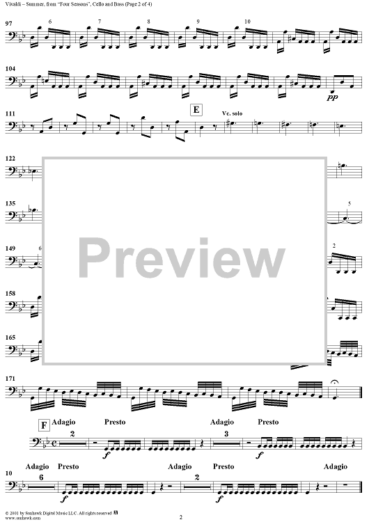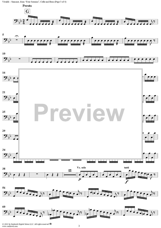 Digital Sheet Music for The Four Seasons, no. 2: Summer - Cello/Bass by Antonio Vivaldi scored for Violin and String Orchestra; id:203818