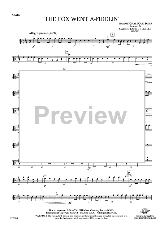 Digital Sheet Music for The Fox Went A-Fiddlin’ - Viola by Carrie Lane Gruselle, Traditional Folk Song scored for Orchestra; id:411536