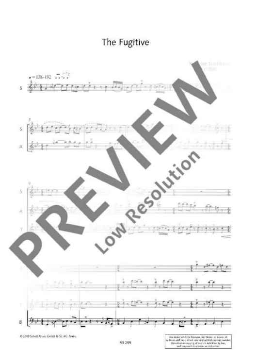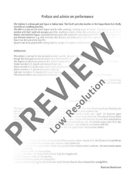 The Fugitive is a three-part jazz fugue in bebop style on a walking bass. The renowned Amsterdam Loeki Stardust Quartet performed the world premiere of the work, created in 2002 by the Dutch recorder player and composer Karel van Steenhoven, founder member of the ensemble. The title is a play on the word 'fugue' and its old meaning of flight or chase. The parts chase after each other with fast solos and licks, flee from each other, until they reach a chaotic climax - after a short quote from the James Bond theme. A striking title by the recorder expert who brilliantly mixes traditional and modern forms, styles and stylistic techniques.