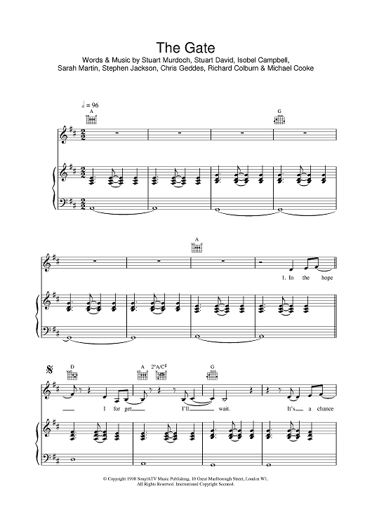 Digital Sheet Music for The Gate by Belle & Sebastian, Michael Cooke, Stuart Murdoch, Stuart David, Isoabel Campbell, Sarah Martin, Stephen Jackson, Chris Geddes, Richard Colburn scored for Piano/Vocal/Chords; id:377319