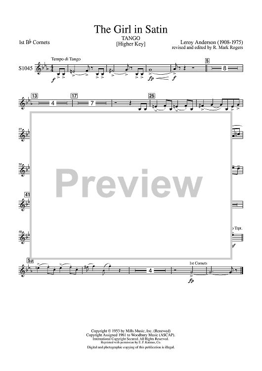 Digital Sheet Music for The Girl in Satin - Bb Cornet 1 by Leroy Anderson scored for Concert Band; id:502217