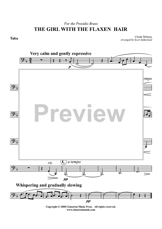 Digital Sheet Music for The Girl with the Flaxen Hair - Tuba by Claude Debussy, Scott Sutherland scored for Brass Quintet; id:415994