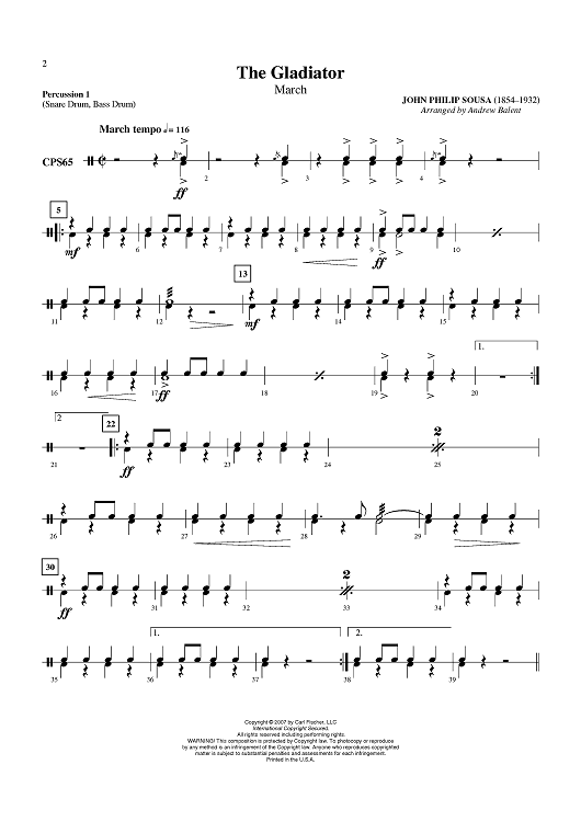 Digital Sheet Music for The Gladiator - Percussion 1 by John Philip Sousa, Andrew Balent scored for Concert Band; id:407231