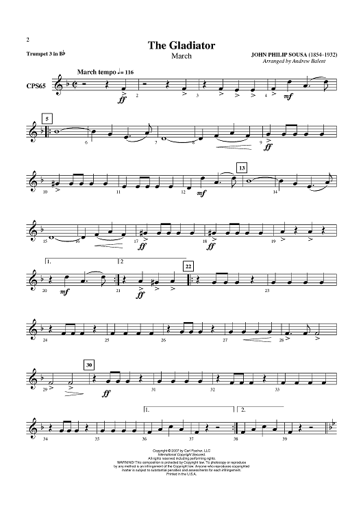 Digital Sheet Music for The Gladiator - Trumpet 3 in B-flat by John Philip Sousa, Andrew Balent scored for Concert Band; id:407221