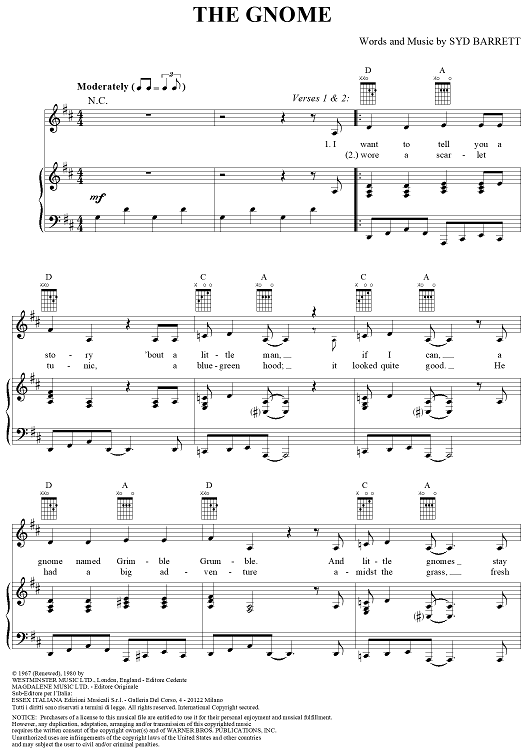 Digital Sheet Music for The Gnome by Pink Floyd, Syd Barrett scored for Piano/Vocal/Chords; id:284272