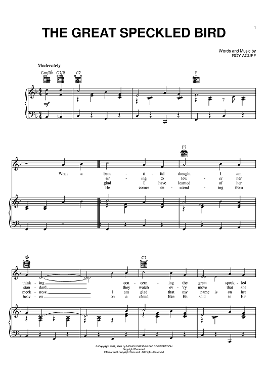 Digital Sheet Music for The Great Speckled Bird by Roy Acuff scored for Piano/Vocal/Chords; id:382050
