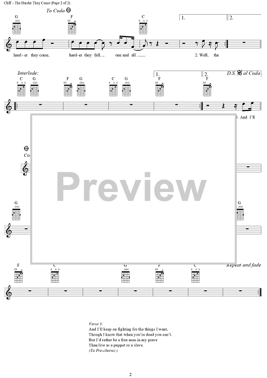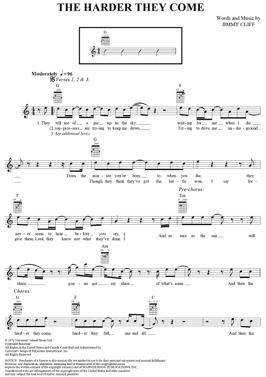 Digital Sheet Music for The Harder They Come by Jerry Garcia, Jimmy Cliff scored for Easy Guitar/Vocal; id:291556