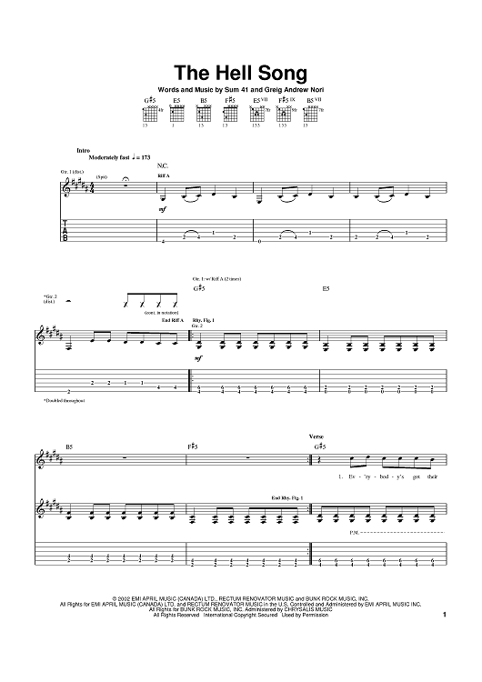 Digital Sheet Music for The Hell Song by Greig Andrew Nori, Sum 41 scored for Guitar Tab; id:371066