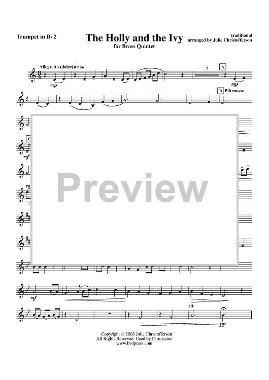 Digital Sheet Music for The Holly and the Ivy - Trumpet 2 by Julie Christofferson, Traditional scored for Brass Quintet; id:312920
