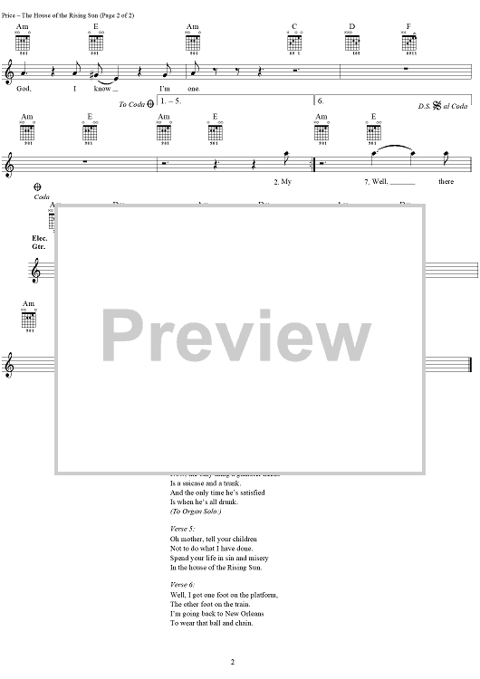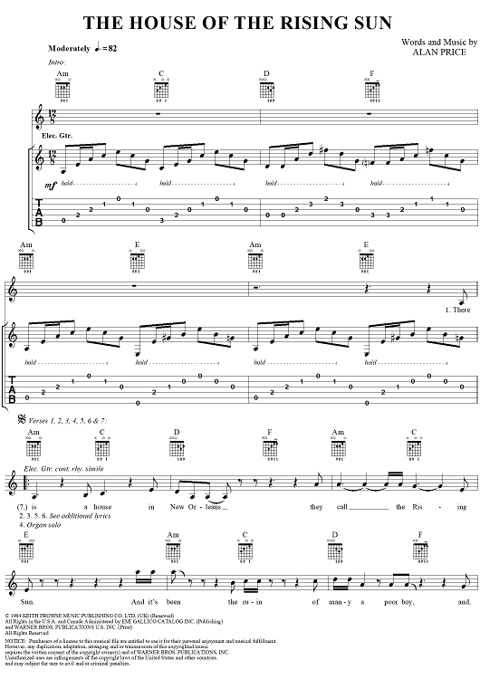 Digital Sheet Music for The House of the Rising Sun by Alan Price, The Animals scored for Easy Guitar Tab/Vocal; id:240296