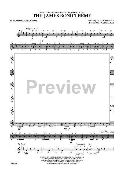 Digital Sheet Music for The James Bond Theme - Baritone Saxophone by Victor Lopez, Monty Norman scored for Concert Band; id:315190
