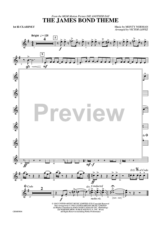 Digital Sheet Music for The James Bond Theme - Clarinet 1 by Victor Lopez, Monty Norman scored for Concert Band; id:315184