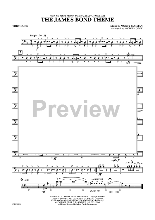 Digital Sheet Music for The James Bond Theme - Trombone by Victor Lopez, Monty Norman scored for Concert Band; id:315195