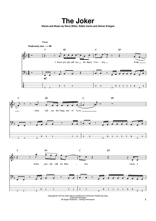 Digital Sheet Music for The Joker by Steve Miller, Eddie Curtis, Ahmet Ertegun, K.D. Lang, Steve Miller Band scored for Bass Tab; id:386270