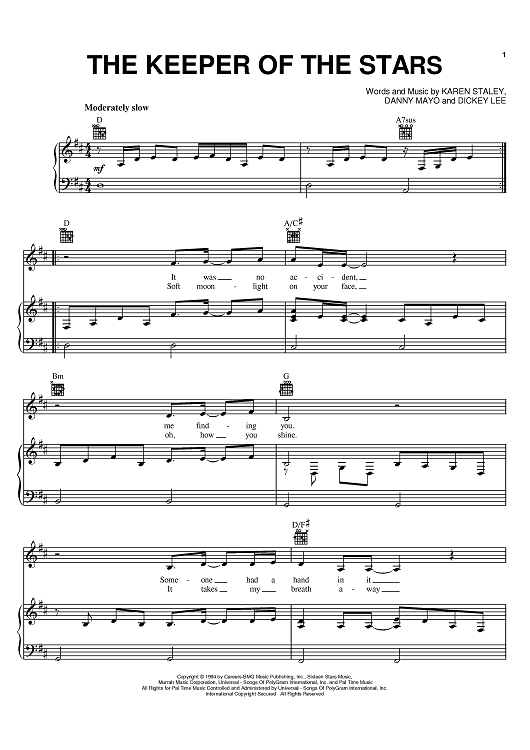 Digital Sheet Music for The Keeper Of The Stars by Tracy Byrd, Dickey Lee, Karen Staley, Danny Mayo scored for Piano/Vocal/Chords; id:367969