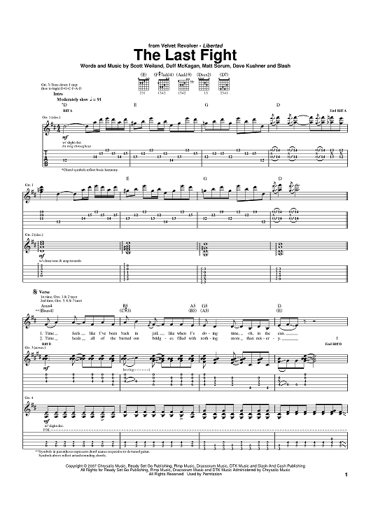 Digital Sheet Music for The Last Fight by Scott Weiland, Slash, Dave Kushner, Duff McKagan, Matt Sorum, Velvet Revolver scored for Guitar Tab; id:402884