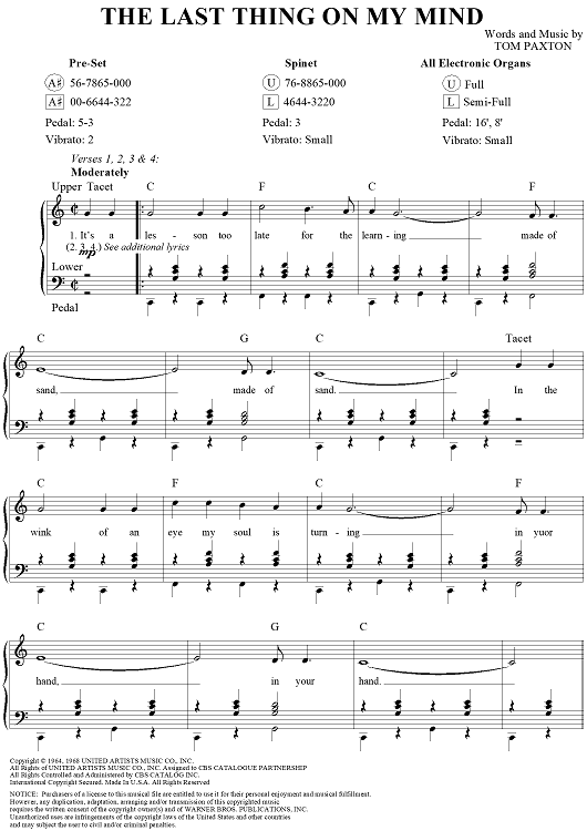Digital Sheet Music for The Last Thing On My Mind by Tom Paxton scored for Easy Organ/Vocal; id:254272