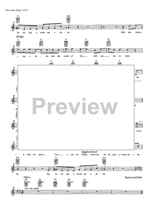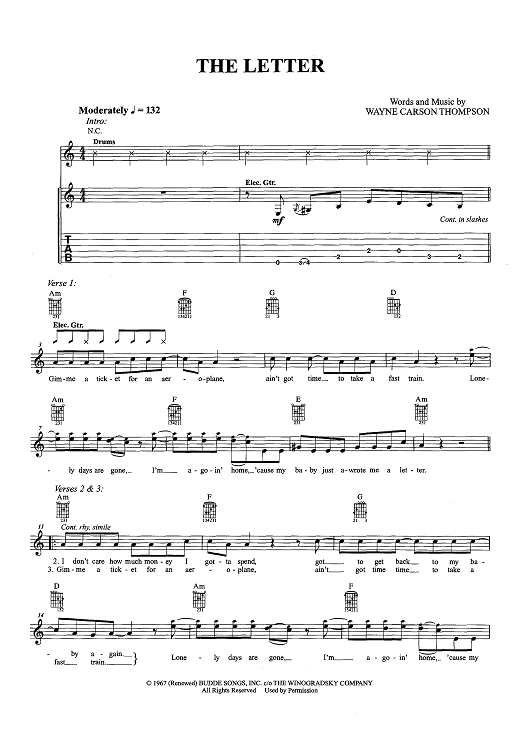 Digital Sheet Music for The Letter by Wayne Thompson, The Box Tops scored for Easy Guitar Tab/Vocal/Chords; id:457192