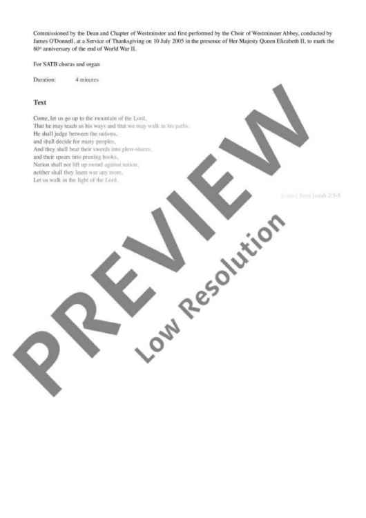 Written to mark the 60th anniversary of the end of World War II, this short choral work is suitable for professional, amateur and church choruses. Premiered at the 2005 Service of Thanksgiving in the presence of Her Majesty The Queen, the use of biblical texts (Isaiah) give this piece a sense of ceremony.