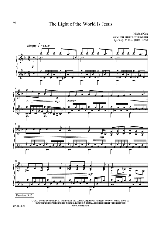 Digital Sheet Music for The Light of the World Is Jesus by Philip P. Bliss, Michael Cox scored for Piano Solo; id:434604