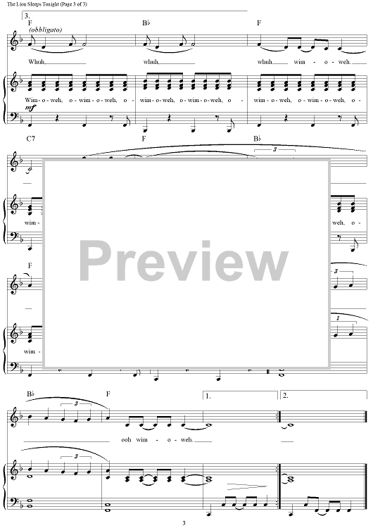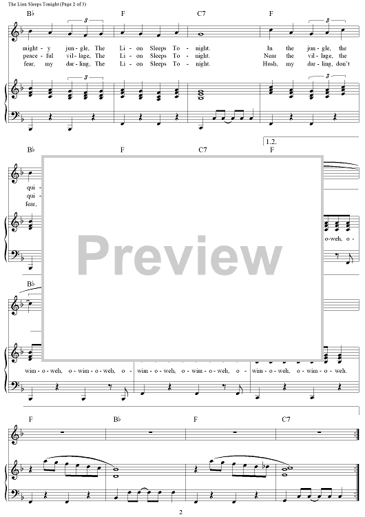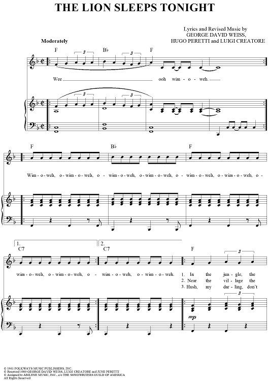 Digital Sheet Music for The Lion Sleeps Tonight by George Weiss, Luigi Creatore, The Tokens, Hugo Peretti scored for Piano/Vocal/Chords; id:112191