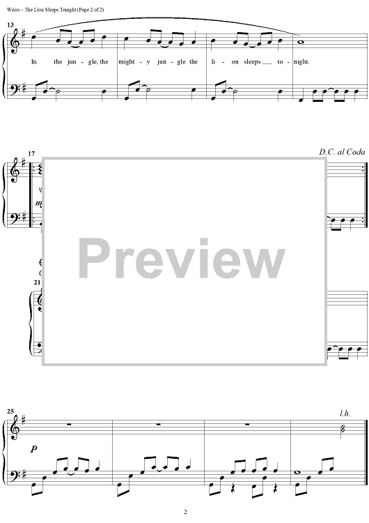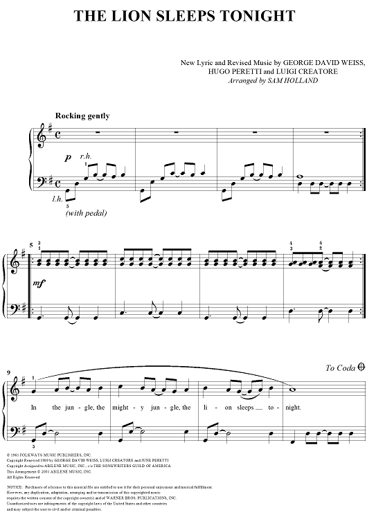 Digital Sheet Music for The Lion Sleeps Tonight by Luigi Creatore, George David Weiss, Sam Holland, Hugo Peretti scored for Easy Piano/Vocal; id:287382