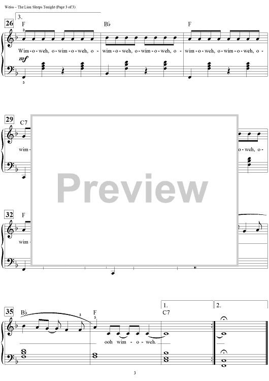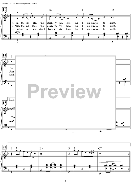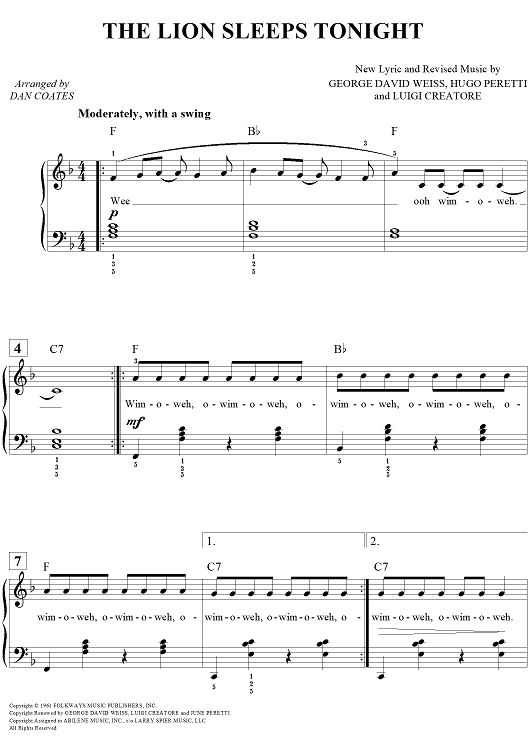 Digital Sheet Music for The Lion Sleeps Tonight by Dan Coates, Luigi Creatore, George David Weiss, Hugo Peretti scored for Easy Piano/Vocal/Chords; id:450631