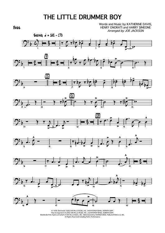 Digital Sheet Music for The Little Drummer Boy - Bass by Henry Onorati, Harry Simeone, Katherine Davis, Joe Jackson scored for Jazz Ensemble; id:358554