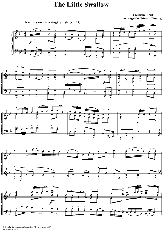 Digital Sheet Music for The Little Swallow by , Edward Bunting, Traditional scored for Piano Solo; id:240564