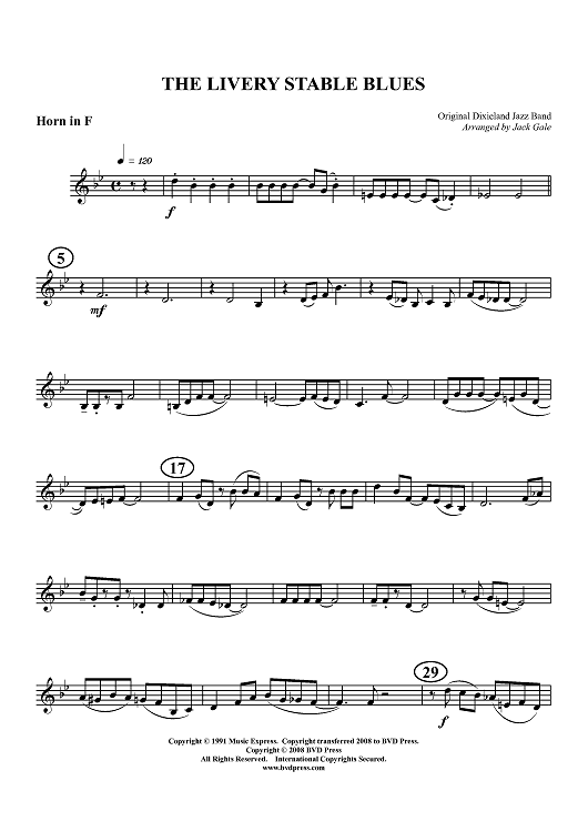 Digital Sheet Music for The Livery Stable Blues - Horn in F by , Original Dixieland Jazz Band, Jack Gale scored for Brass Quintet; id:411823