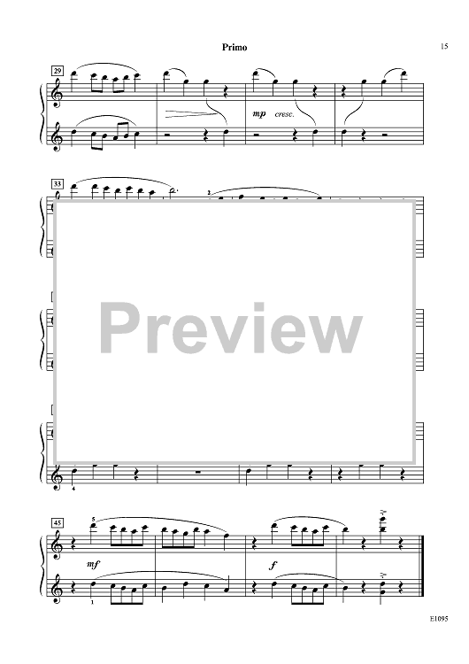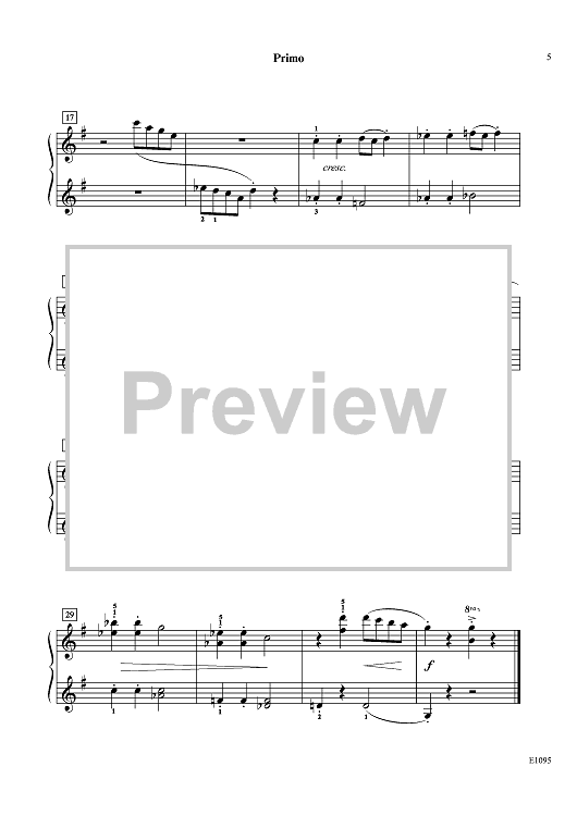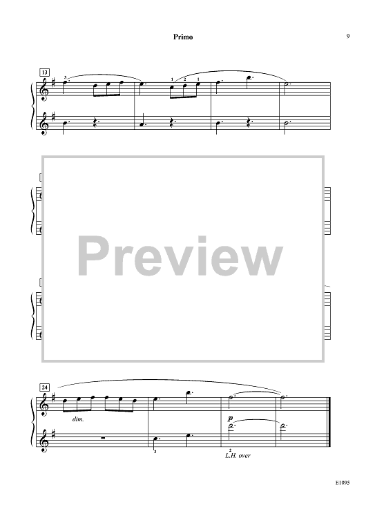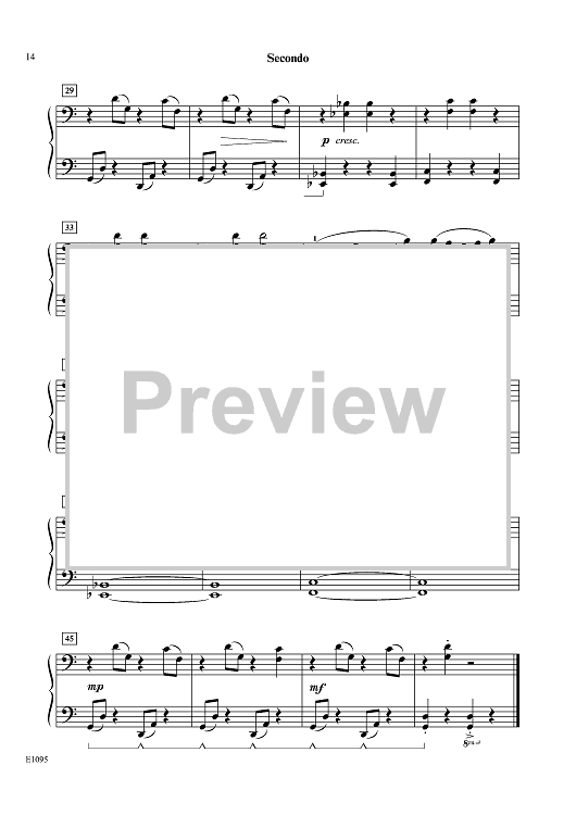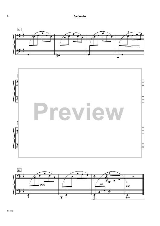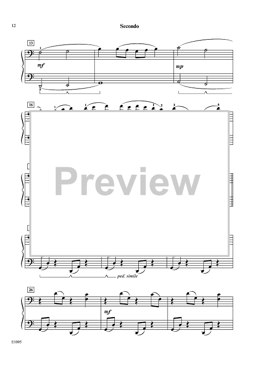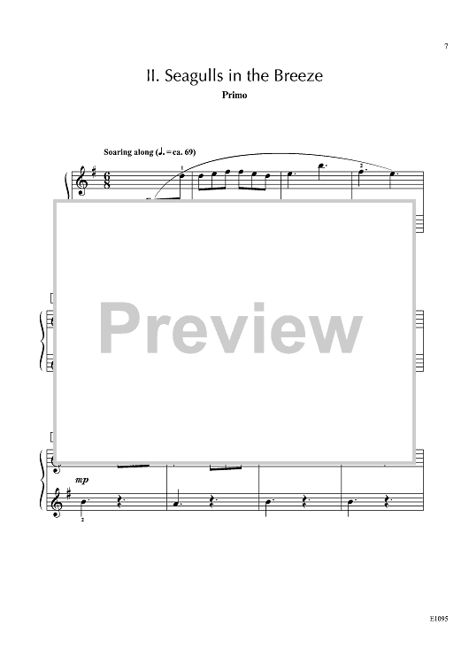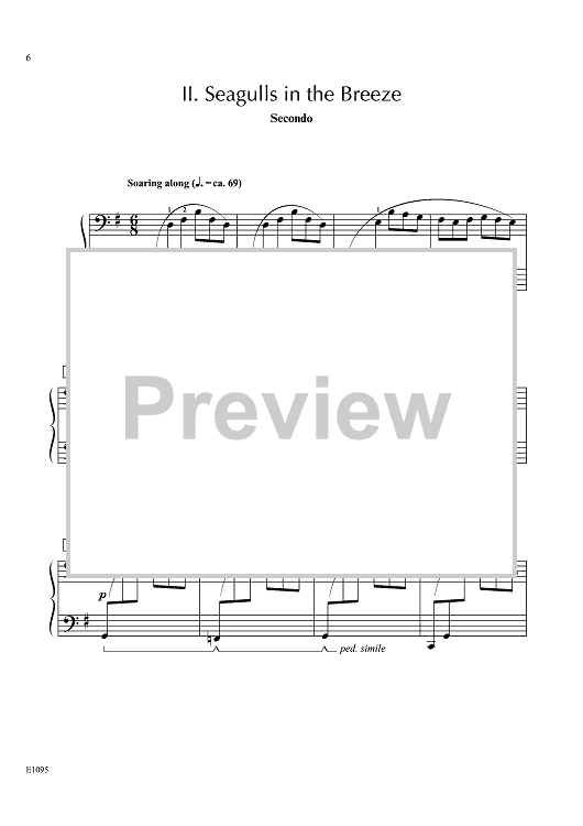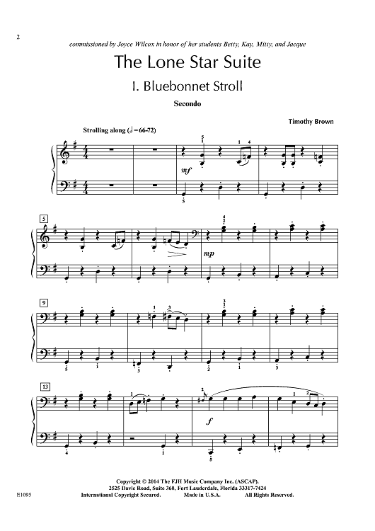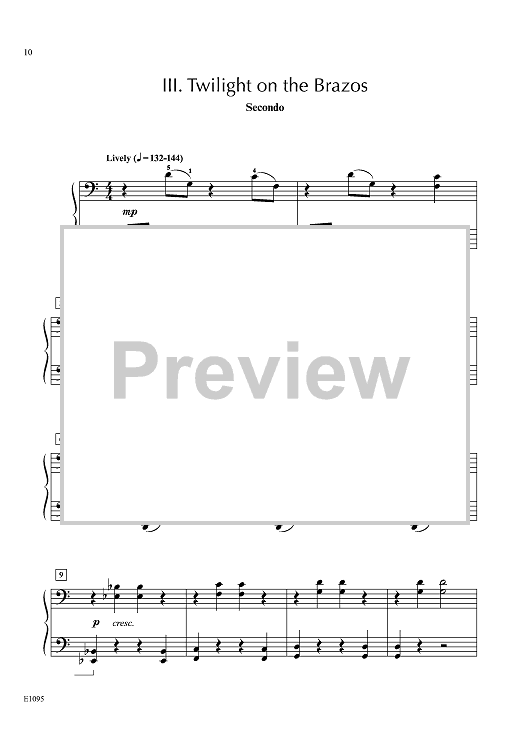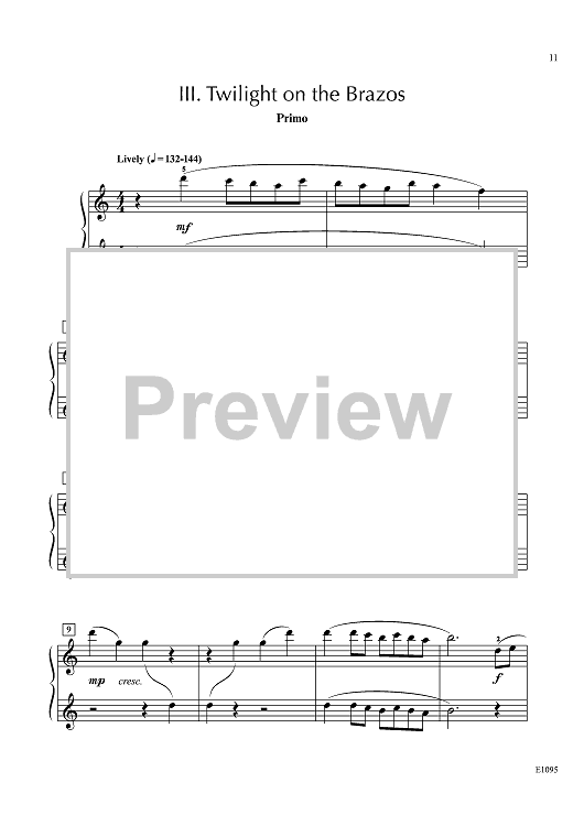 This three-movement suite for four hands is a tribute to the sights and sounds of Texas, the "Lone Star State." The first movement Bluebonnet Stroll is reminiscent of the Old West; the second Seagulls in the Breeze is tranquil - a lyrical interlude between two energetic movements; and the third Twilight on the Brazos is a contemporary look at the regional flavor of the Brazos River.