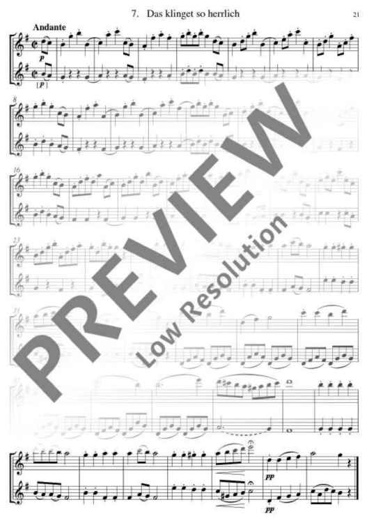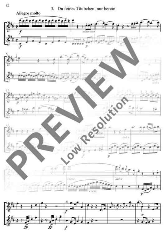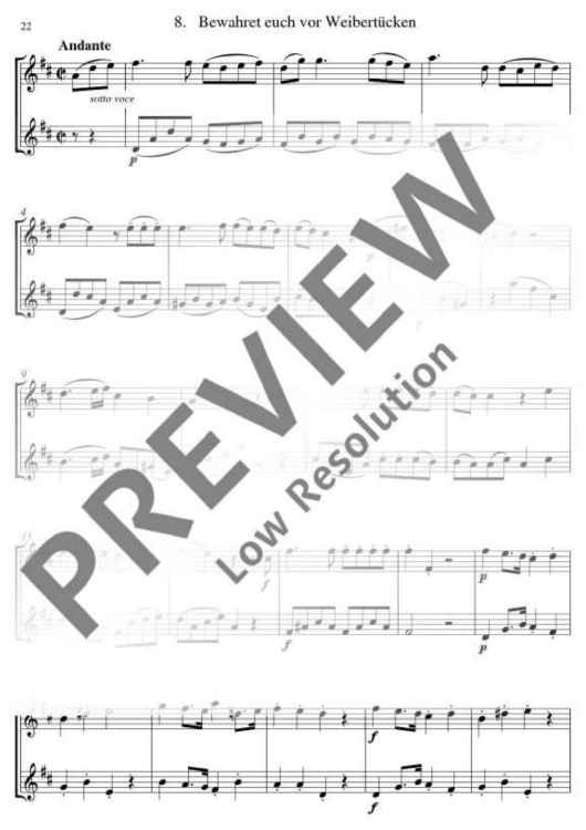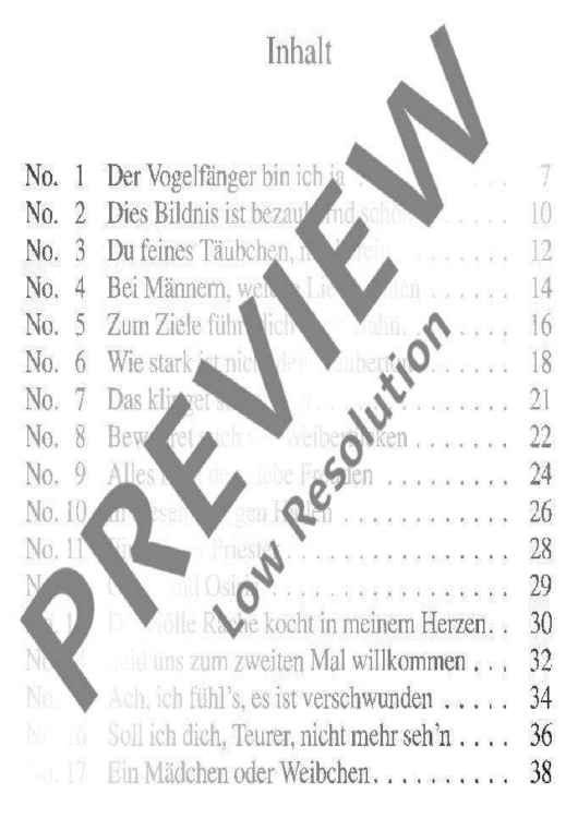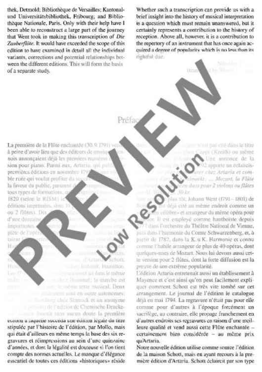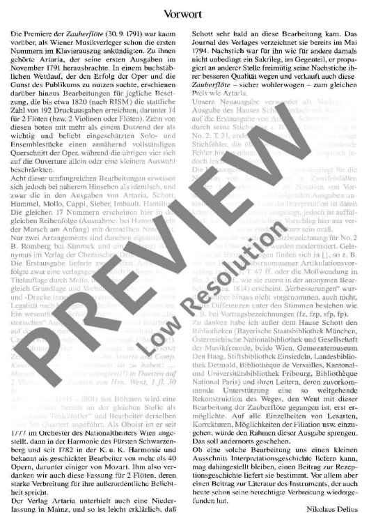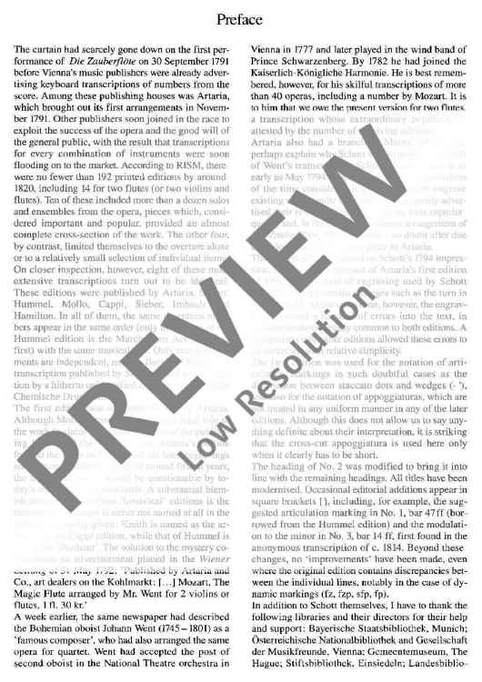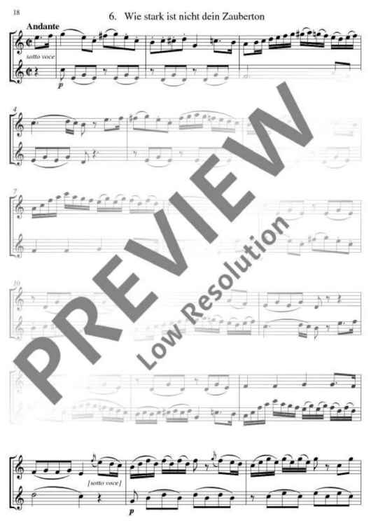 Schon bald nach den Uraufführungen der Mozart-Opern erschienen Bearbeitungen der populärsten Nummern für die unterschiedlichsten Instrumental-Besetzungen. Neben Fassungen für Harmonie-Musik gab es auch solche für einzelne Instrumentengruppen. Die vorliegende Version von 17 Nummern aus „Die Zauberflöte“, bearbeitet für 2 Flöten, stammt von dem Mozart-Zeitgenossen Johann Went, einem der bedeutendsten Arrangeure dieser Zeit. Bereits im Jahr 1794 erschien sie im Schott-Verlag und erfreute sich bei Schülern und Musikern außerordentlicher Beliebtheit. Ein Blick in das Inhaltsverzeichnis zeigt, dass keine der gängigen Melodien ausgespart wurde: „Der Vogelfänger bin ich ja“ – „Dies Bildnis ist bezaubernd schön“ – „In diesen heil’gen Hallen“ – „O Isis und Osiris“ – „Der Hölle Rache“ – „Ein Mädchen oder Weibchen“ – sowie elf weitere Nummern bieten einen repräsentativen Querschnitt durch die Oper.