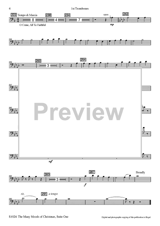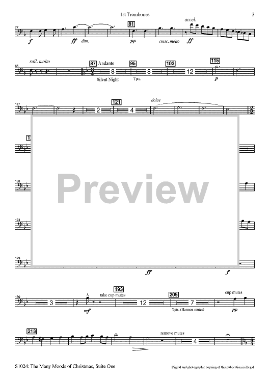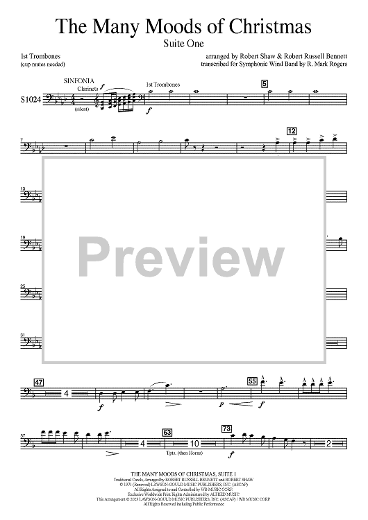 Digital Sheet Music for The Many Moods of Christmas: Suite No. 1 - Trombone 1 by Robert Russell Bennett, R. Mark Rogers, Robert Shaw scored for Concert Band; id:502771
