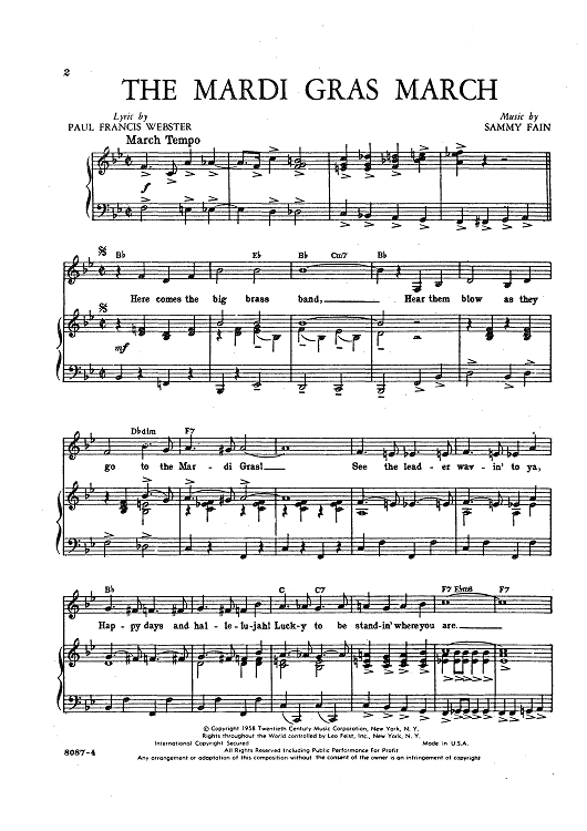 Digital Sheet Music for The Mardi Gras March by Sammy Fain, Paul Francis Webster, Pat Boone, Gary Crosby, Tommy Sands scored for Piano/Vocal/Chords; id:423164