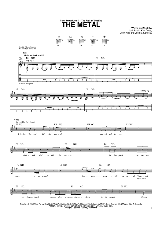 Digital Sheet Music for The Metal by John King, Jack Black, Kyle Gass, John S. Konesky, Tenacious D scored for Guitar Tab; id:401993