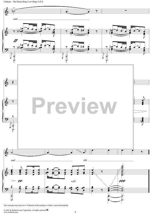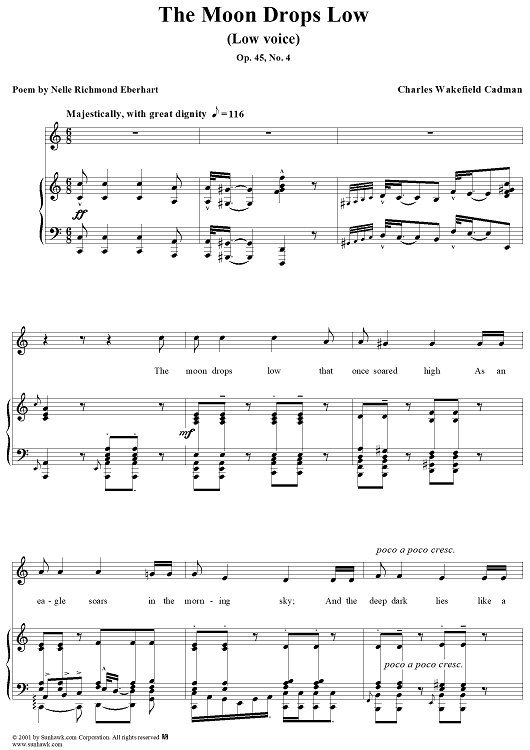 Digital Sheet Music for The Moon Drops Low - Low Voice by Charles Wakefield Cadman, Nelle Richmond Eberhart scored for Piano/Vocal; id:262691