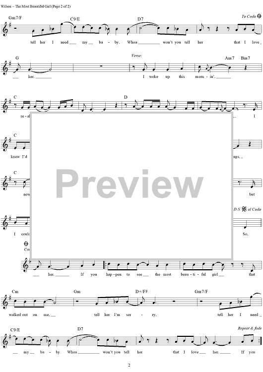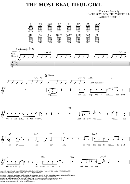 Digital Sheet Music for The Most Beautiful Girl by Charlie Rich, Norris Wilson, Kenn Chipkin, Billy Sherrill, Rory Bourke scored for Lead Sheet; id:263796