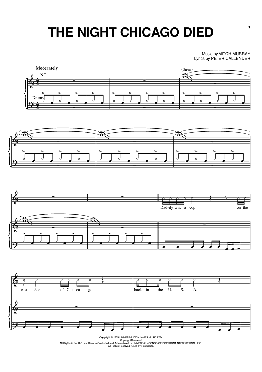 Digital Sheet Music for The Night Chicago Died by Mitch Murray, Peter Callander, Paper Lace scored for Piano/Vocal/Chords; id:395041