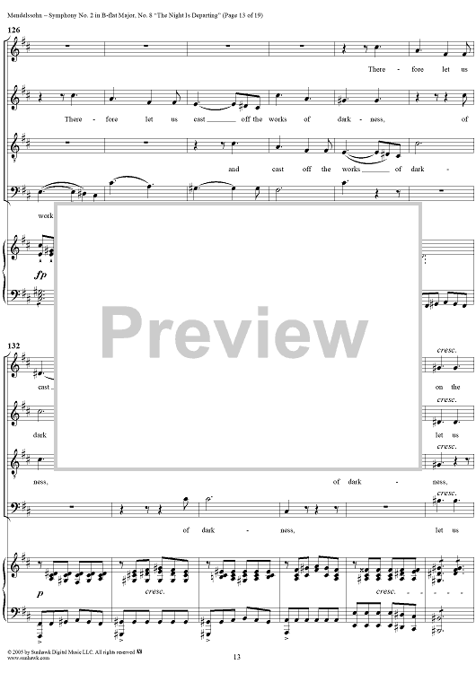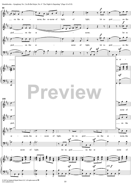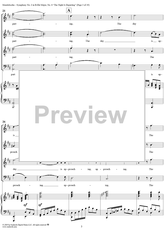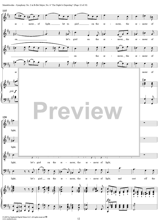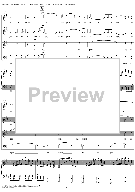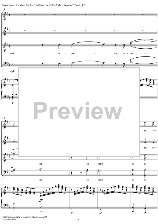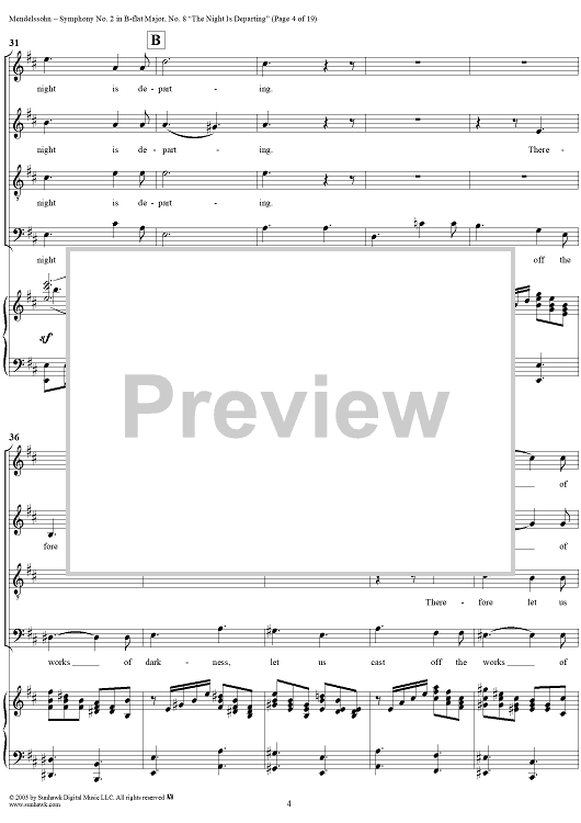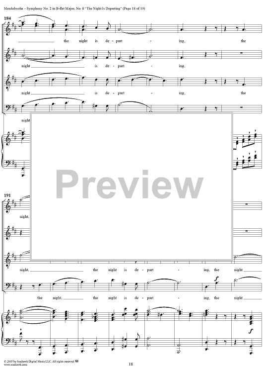 Digital Sheet Music for The night is departing (Chorus), No. 8 from Symphony No. 2 in B-flat Major "Hymn of Praise", Op. 52 by Felix Mendelssohn scored for Four-part Mixed Chorus/Piano; id:307163
