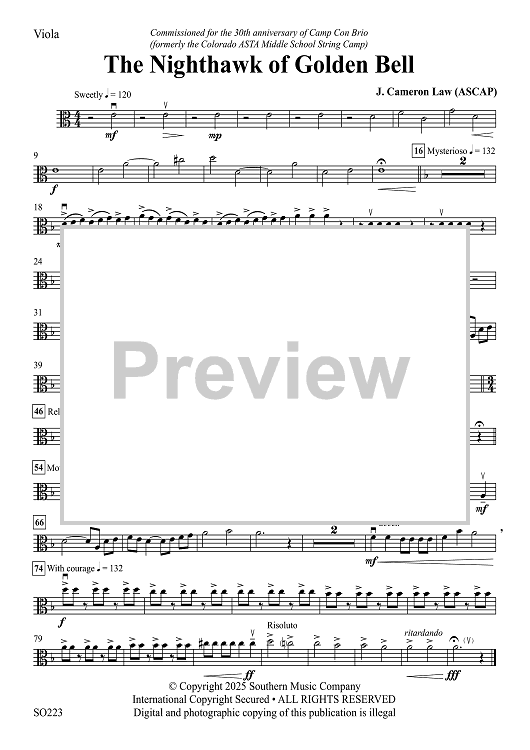 "The Nighthawk of Golden Bell - Viola" Sheet Music by J. Cameron Law