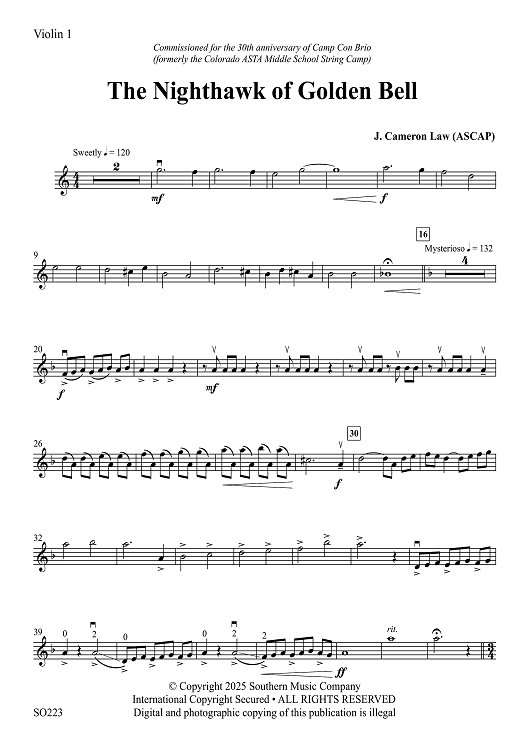"The Nighthawk of Golden Bell - Violin 1" Sheet Music by J. Cameron Law