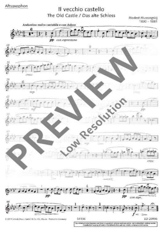 With his piano cycle "Pictures at an Exhibition" from 1874, Mussorgsky created a classic example of programme music. Based on the paintings of his deceased friend Viktor Hartmann, he also composed the lyrical serenade 'Il vecchio castello' (The Old Castle), among others. Hartmann's picture shows a medieval Italian castle with a singing troubadour who accompanies himself on the lute. In Maurice Ravel's subsequent famous orchestral version, the beautiful, melancholy melody was played by the alto saxophone. Accompaniment, prelude and interludes are reminiscent of playing a medieval hurdy-gurdy with its pervading drone bass. Therein lies the continuity of the piece, thereabove lies the quiet romance with its melancholy character – the unrequited love of the troubadour. This separate edition now gives all saxophonists the opportunity to play the piece with piano accompaniment.