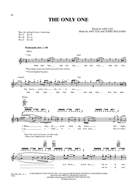 Digital Sheet Music for The Only One by Evanescence, Amy Lee, Terry Balsamo scored for Guitar Tab/Vocal; id:360496